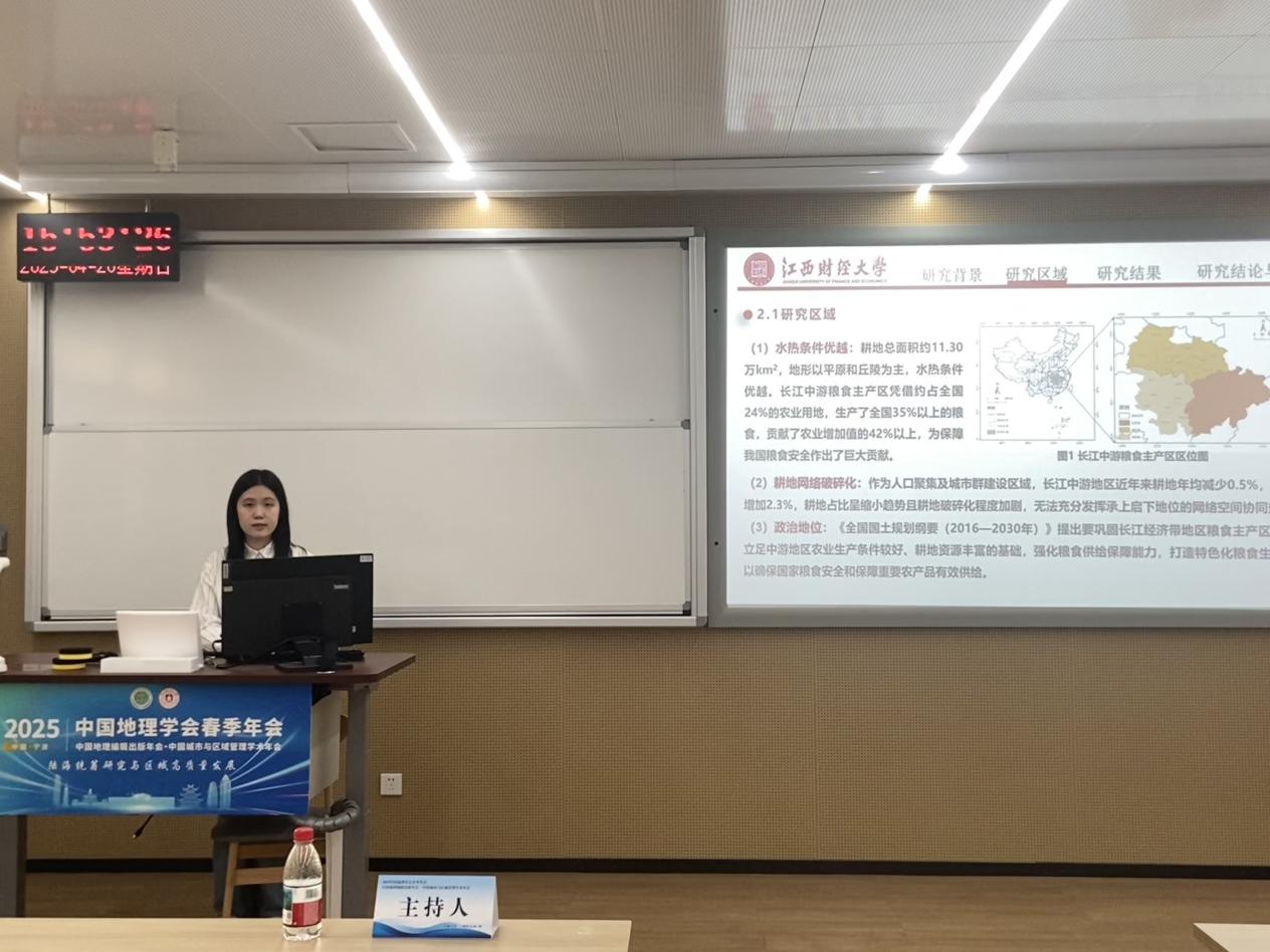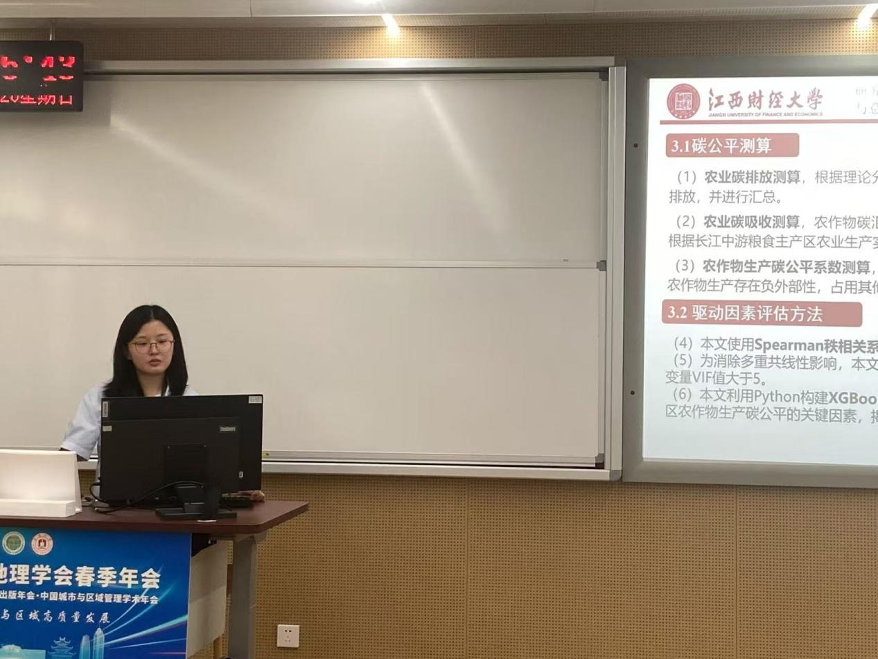 袁梦涵硕士(指导老师:吕添贵教授)在应用地理学分会场进行题为《基于机器学习的长江中游粮食主产区农作物生产碳公平时空特征与驱动因素研究》的论文宣讲。该论文基于碳源—碳汇测度农作物生产碳公平系数,运用 XGboost 机器学习模型识别关键驱动因素。创新性地从碳源汇视角分析碳公平时空特征,借助机器学习模型揭示驱动机制,为制定差异化农业碳减排政策提供实践指导,助力精准识别区域农业生产碳排放差异与均衡性,为缩小地区农业生产碳排放差异提供决策依据。该报告的研究内容、研究逻辑和研究结果获得了与会专家高度点评,为后续研究指明了新方向。