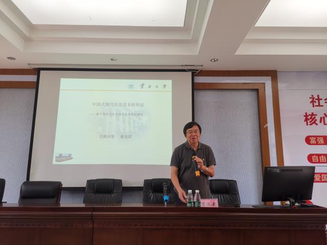 4月28日,云南省人民政府参事,云南大学特聘教授、博士生导师崔运武教授做客公共管理学院,并在财税大楼405会议室为我院师生作了题为《中国式现代化及其本质特征——基于现代化在中国历史进程的分析 》的学术讲座。本次讲座由副院长杨道田主持,学院硕士研究生和部分教师30余人参加了此次讲座。