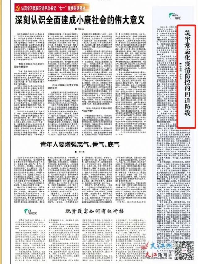 学习抗疫精神,弘扬抗疫精神,就是要把抗疫精神体现在本职岗位上。支部党员立身本职岗位,在岗位中为疫情防控献智献力。作为班长,万思敏用认真和负责的态度严格落实班长责任制,将每项工作快速、精准完成,做好了班级与学院之间的对接人。丁振文作为寝室长,他不仅督促寝室成员及时完成核酸检测,还不时提醒室友带好口罩、保持安全距离,将细小平凡的工作扎扎实实地做好,尽职尽责地落实寝室长包寝制。罗家为博士在江西日报撰文发表文章《筑牢常态化疫情防控的四道防线》,为疫情防控贡献自己的智慧。