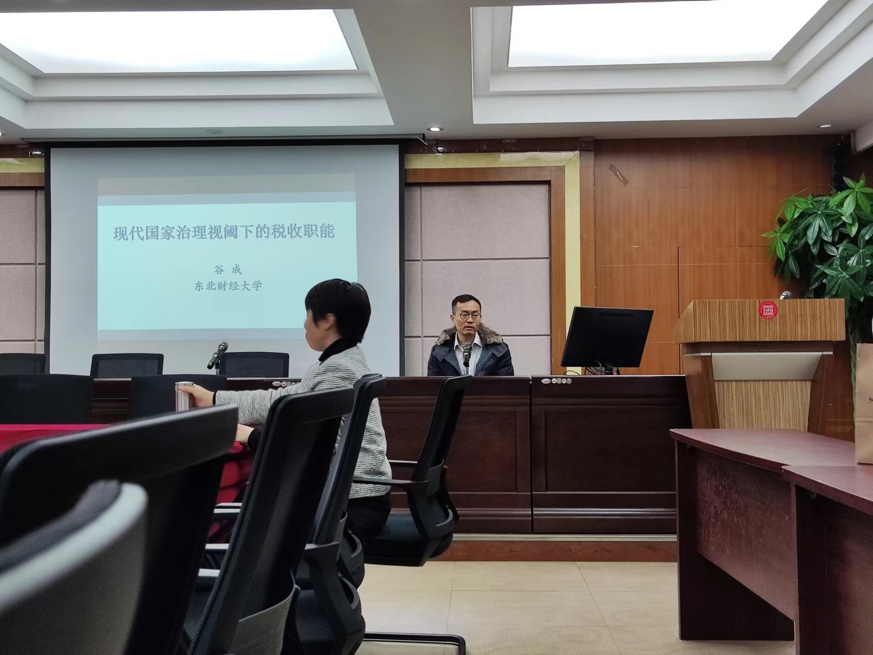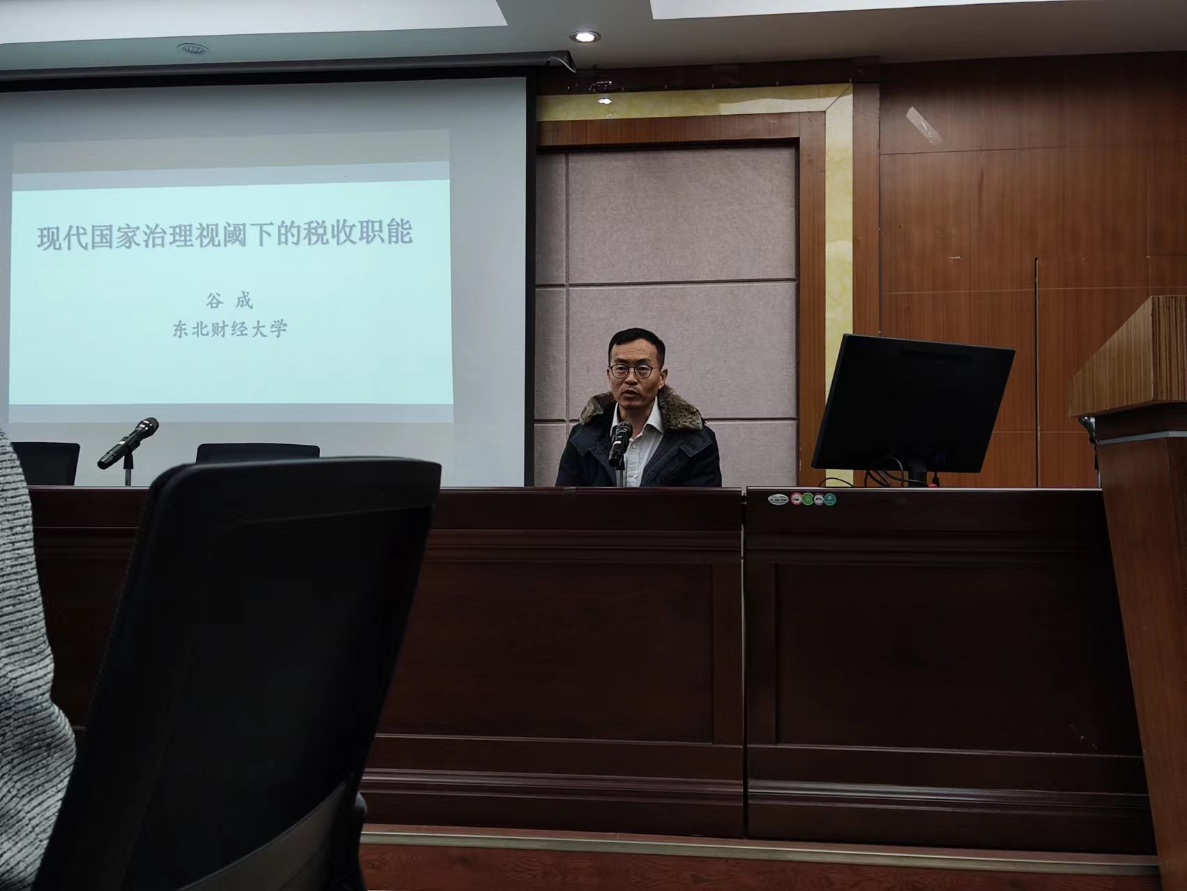 11月26日下午,应财税与公共管理学院邀请,东北财经大学财政税务学院院长谷成教授做客“财税论坛”,作了题为“现代国家治理视阈下的税收职能”的学术讲座。财税与公共管理学院副院长戴丽华主持讲座,老师刘辉、徐建斌、何凡及财政系在读研究生30余人参与交流。