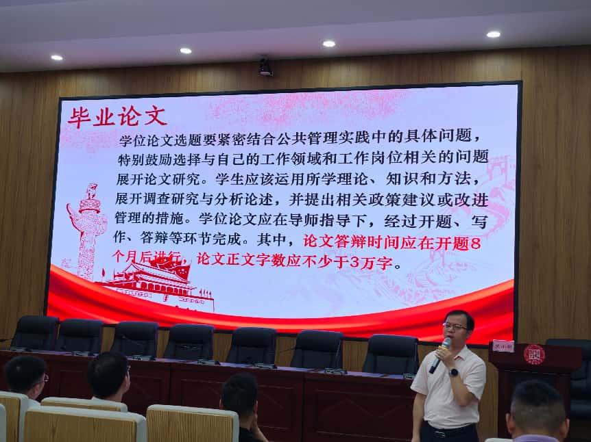新生入学教育阶段,熊小刚书记为新生讲授入学教育课,详细介绍了我校MPA研究生的培养目标、培养方向、培养方式、培养过程、重要活动等,帮助新生全面系统地了学院情况以及后续学习内容,更好地融入校园生活。